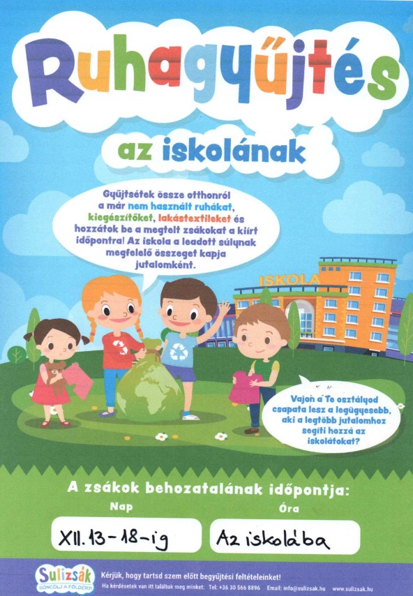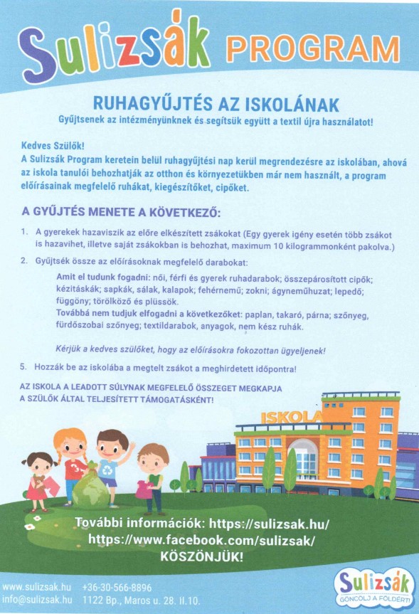 A Sulizsák Program keretein belül 2023.12.13-18. között ruhagyűjtési nap kerül megrendezésre az iskolában, ahová behozhatják az otthon és környezetükben már nem használt, a program előírásainak megfelelő ruhákat, kiegészítőket, cipőket.