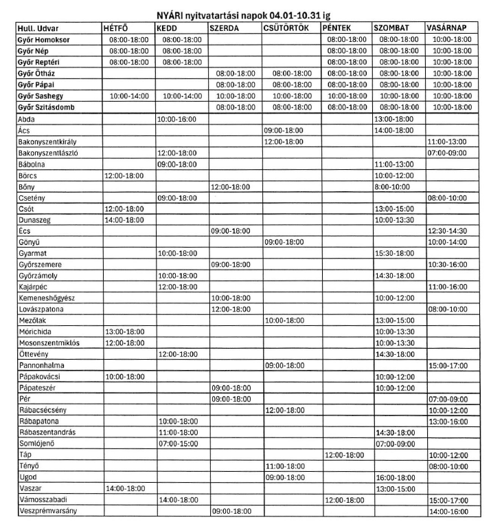 A GYHG Győri Hulladékgazdálkodási Nonprofit Kft. tájékoztatja a Tisztelt Önkormányzatot és a lakosságot, hogy a cégük üzemeltetésében lévő vidéki hulladékudvarok 2025. április 01-től nyári nyitvatartási rendre térnek át.