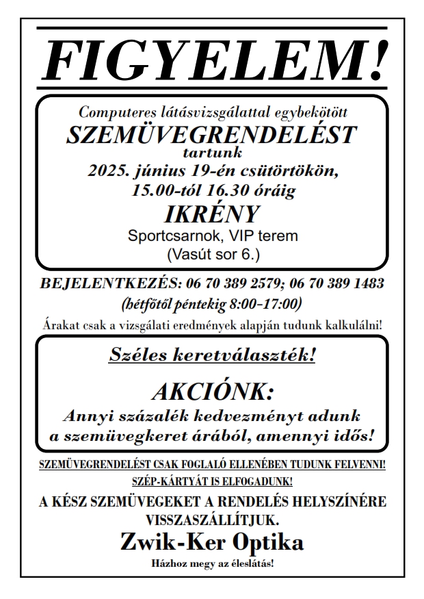 Computeres látásvizsgálattal egybekötött szemüvegrendelést tart a Zwik-Ker Optika Ikrényben 2025.06.19-én 15.00-16.30-ig a Sportcsarnok VIP teremben.