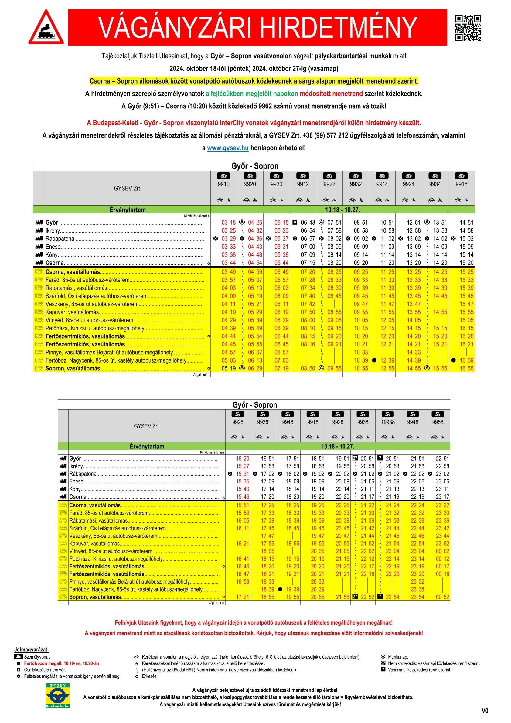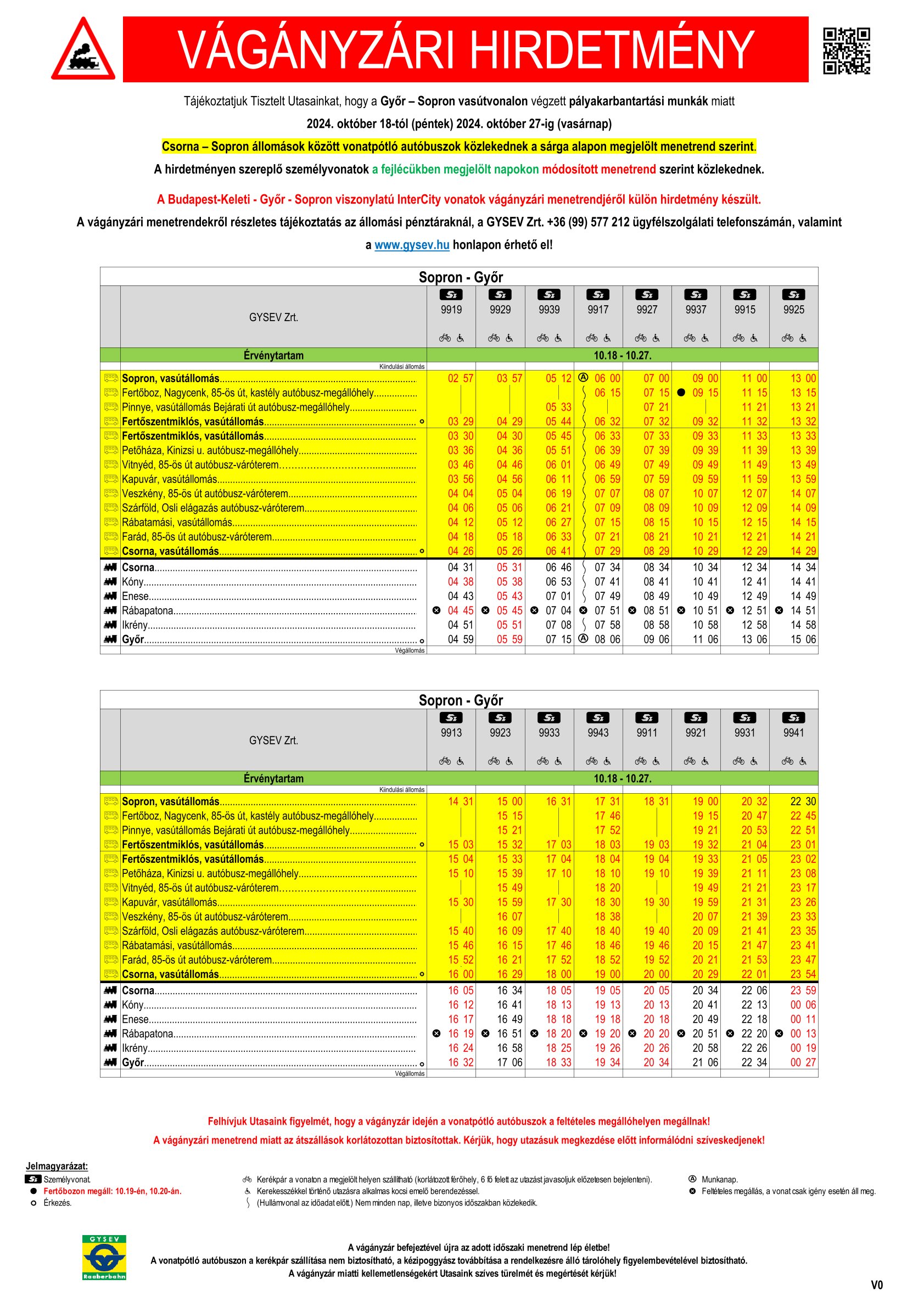 A GYSEV Zrt. tájékoztatása alapján a Győr – Sopron vasútvonalon végzett pályakarbantartási munkák miatt 2024. október 18-tól (péntek) 2024. október 27-ig (vasárnap) Csorna – Sopron állomások között vonatpótló autóbuszok közlekednek a sárga alapon megjelölt menetrend szerint.