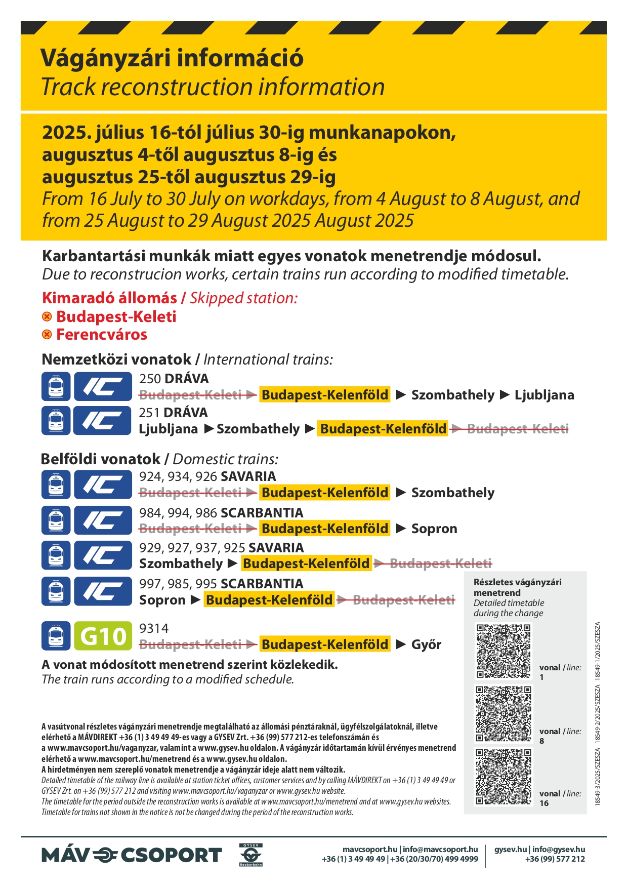 A vágányzár időtartamán kívül érvényes menetrend elérhető a www.mavcsoport.hu/menetrend és a www.gysev.hu oldalon.