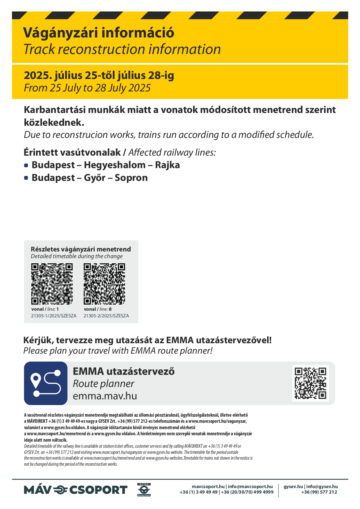 A MÁV-CSOPORT tájékoztatása alapján 2025. július 25-től július 28-ig karbantartási munkák miatt a vonatok módosított menetrend szerint közlekednek.