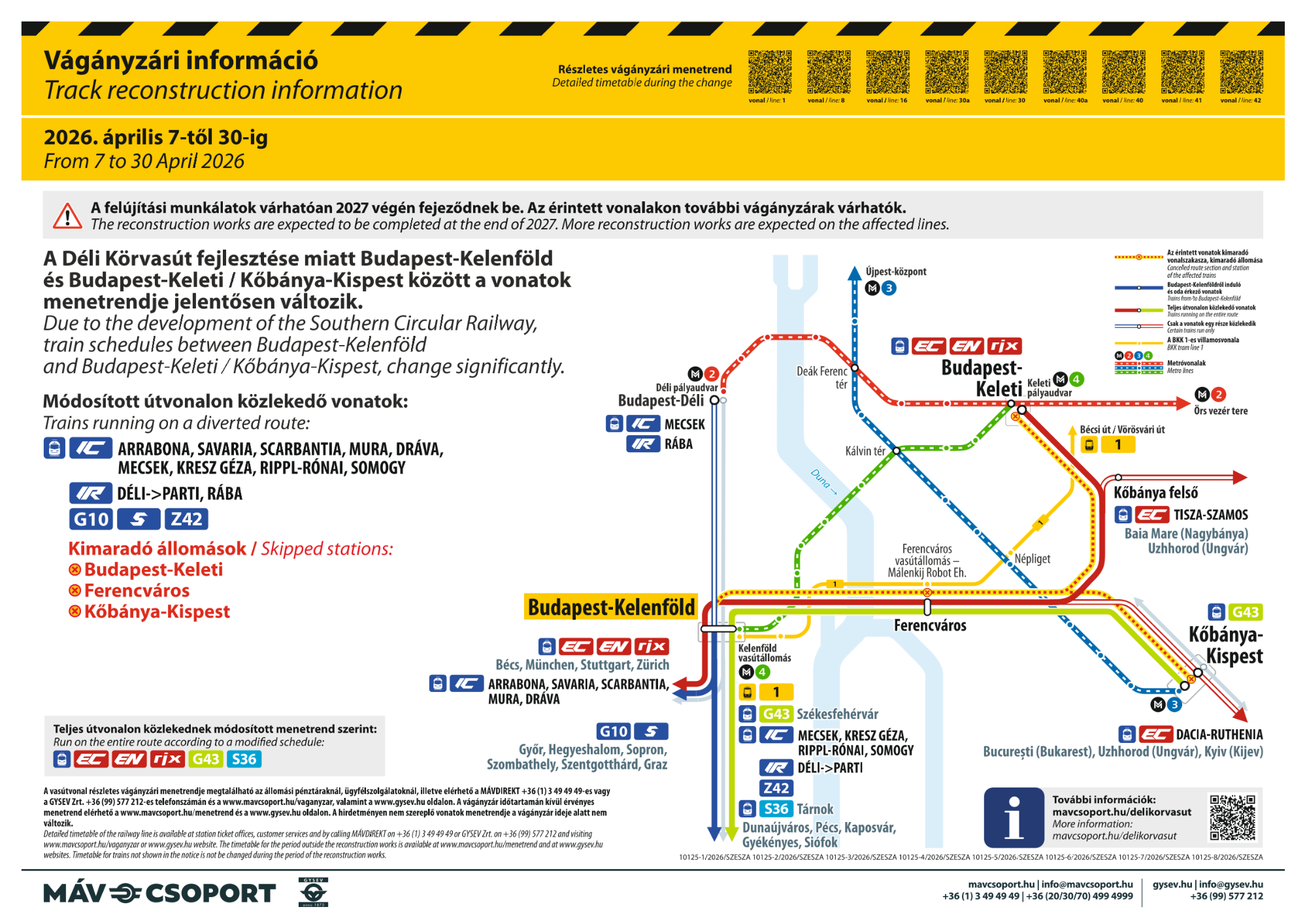 2026. április 7-től április 30-ig módosított menetrend szerint közlekednek a vonatok. A részletes menetrend a képre kattintva olvasható.