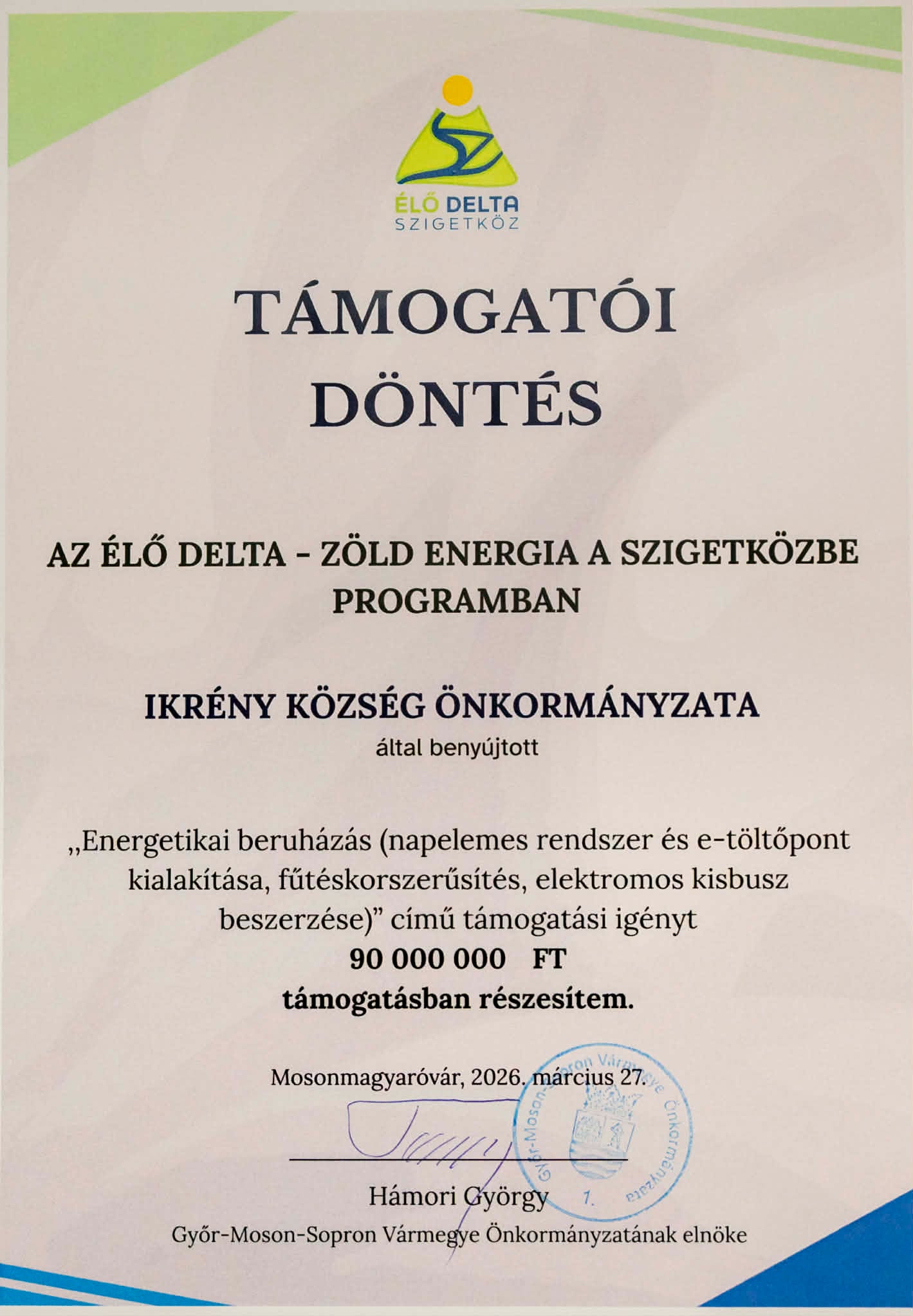 A támogatói okiratot Németh Tamás, Ikrény község polgármestere vehette át dr. Raisz Anikótól, az Energiaügyi Minisztérium környezetügyért felelős államtitkárától, dr. Hámori Györgytől, Győr-Moson-Sopron Vármegyei Közgyűlés elnökétől, valamint dr. Nagy Istvántól, Magyarország agrárminiszterétől, országgyűlési képviselőtől.