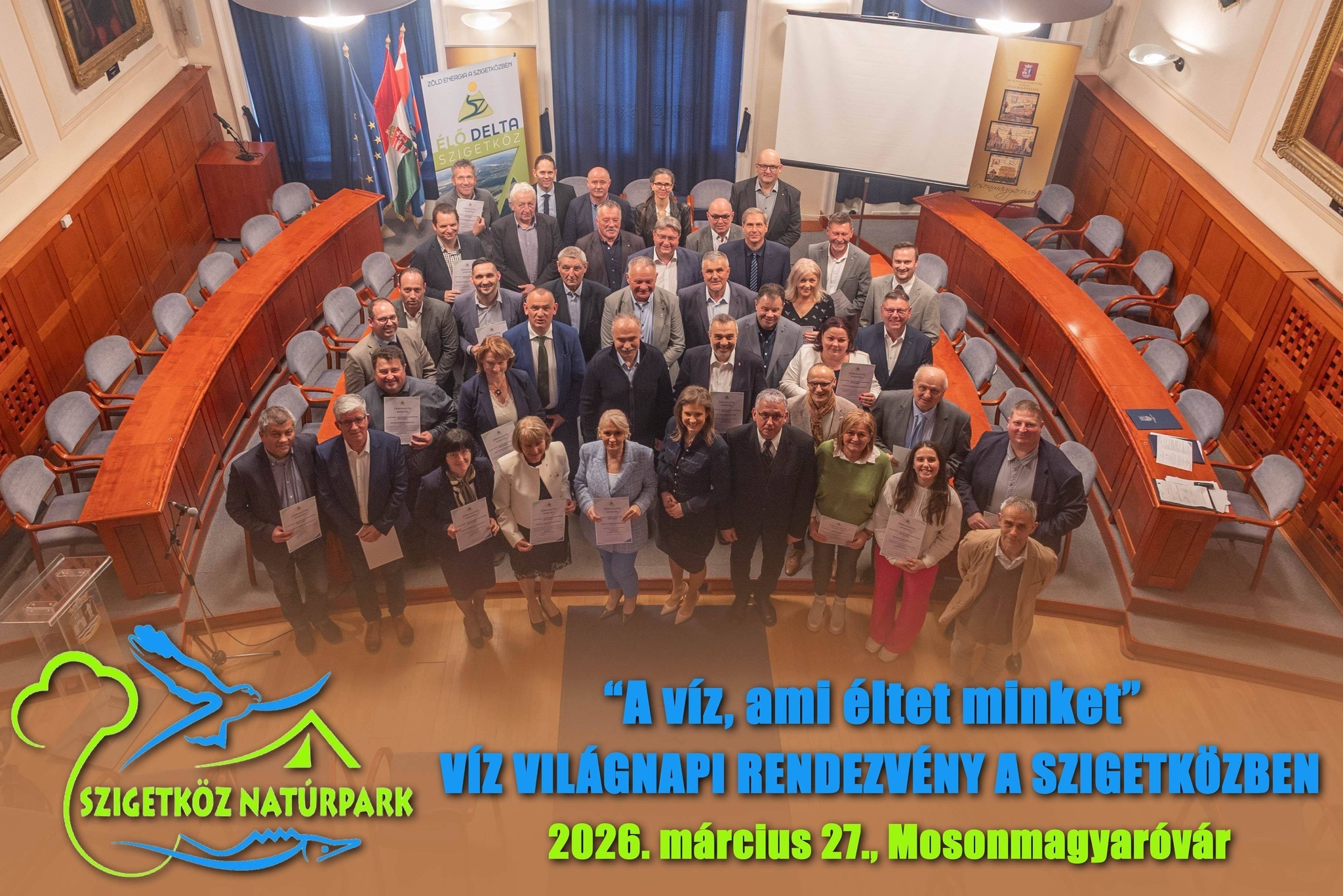 A Mosonmagyaróvári Városháza dísztermében, a Víz Világnapjához kapcsolódva került sor az „Élő Delta – Zöld Energia Szigetközbe Program” ünnepélyes támogatói okiratátadására 2026. március 27-én, a Szigetköz Natúrpark szervezésében.
