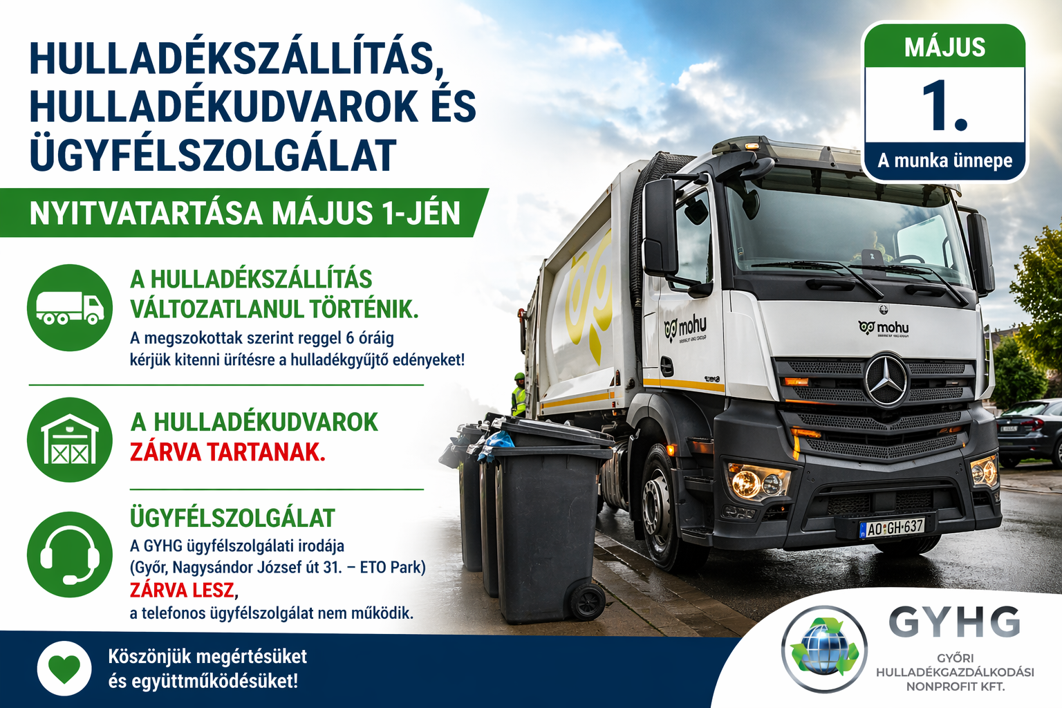 A GYHG Győri Hulladékgazdálkodási Nonprofit Kft. ügyfélszolgálati irodája a Győr Nagysándor József út 31. címen (ETO Park) május 1-jén zárva lesz, a telefonos ügyfélszolgálat nem működik.