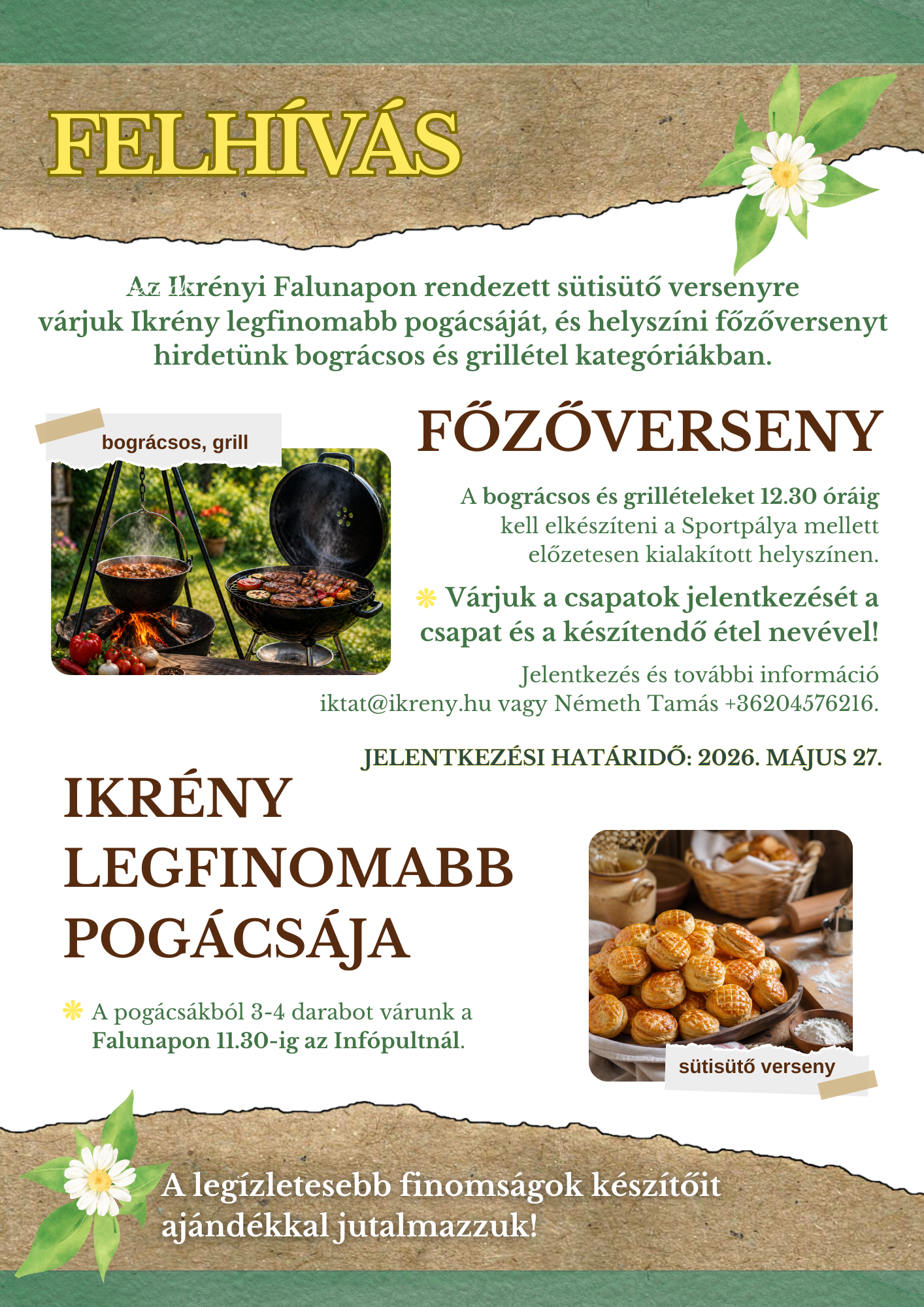 Várjuk a lelkes csapatokat bográcsos és grillétel kategóriákban is! Jelentkezési határidő: 2026. május 27., (részletek a plakáton).