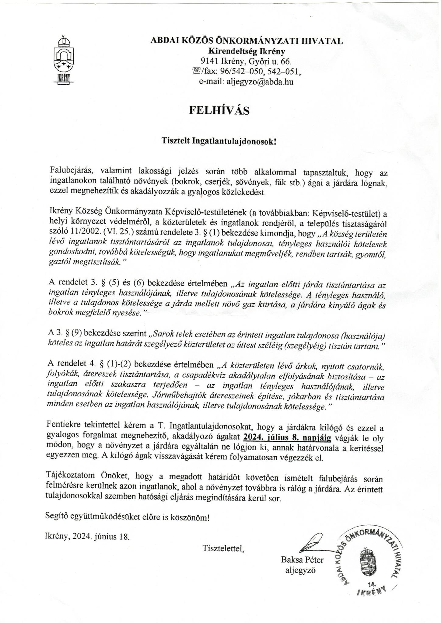 Baksa Péter aljegyző: aljegyzo@abda.hu